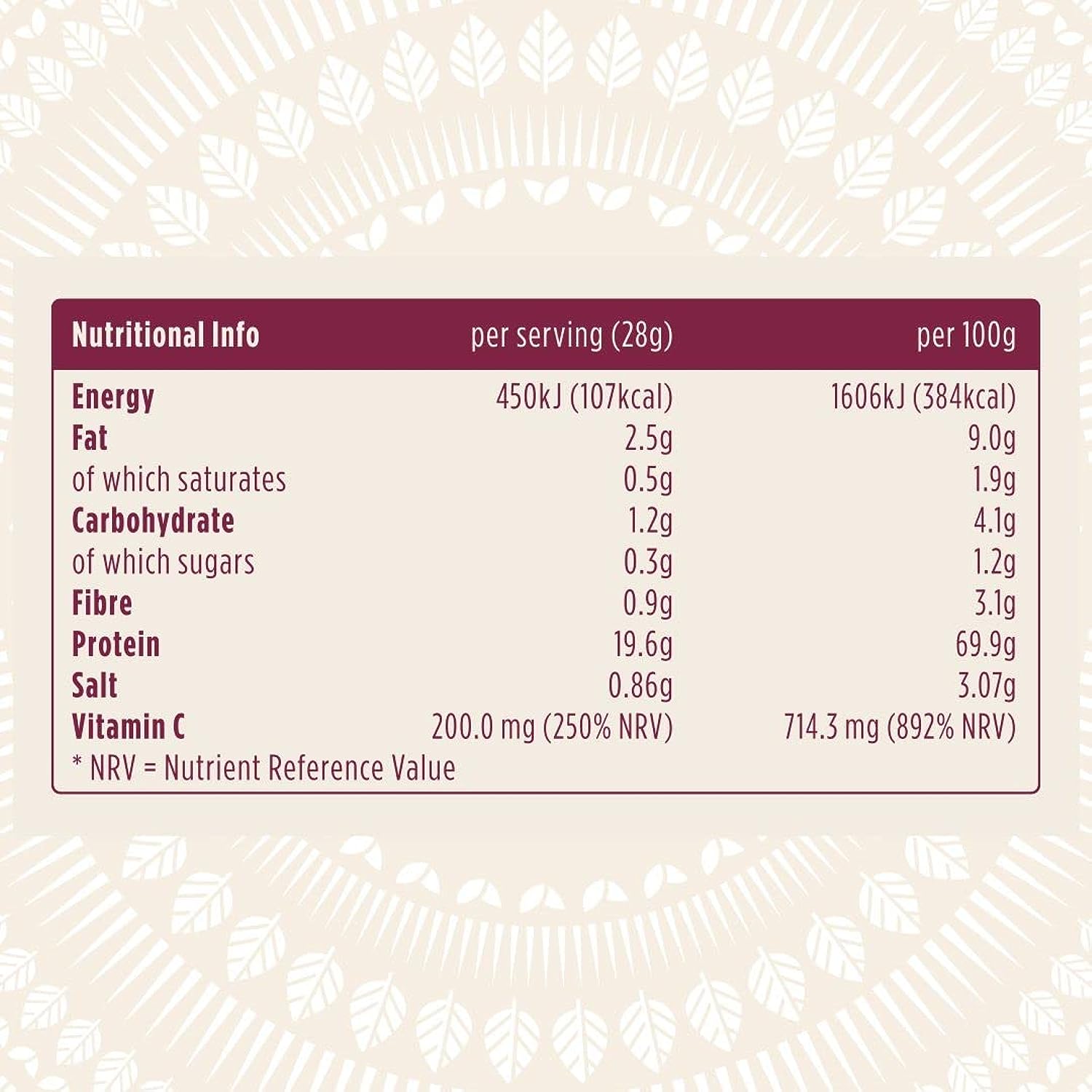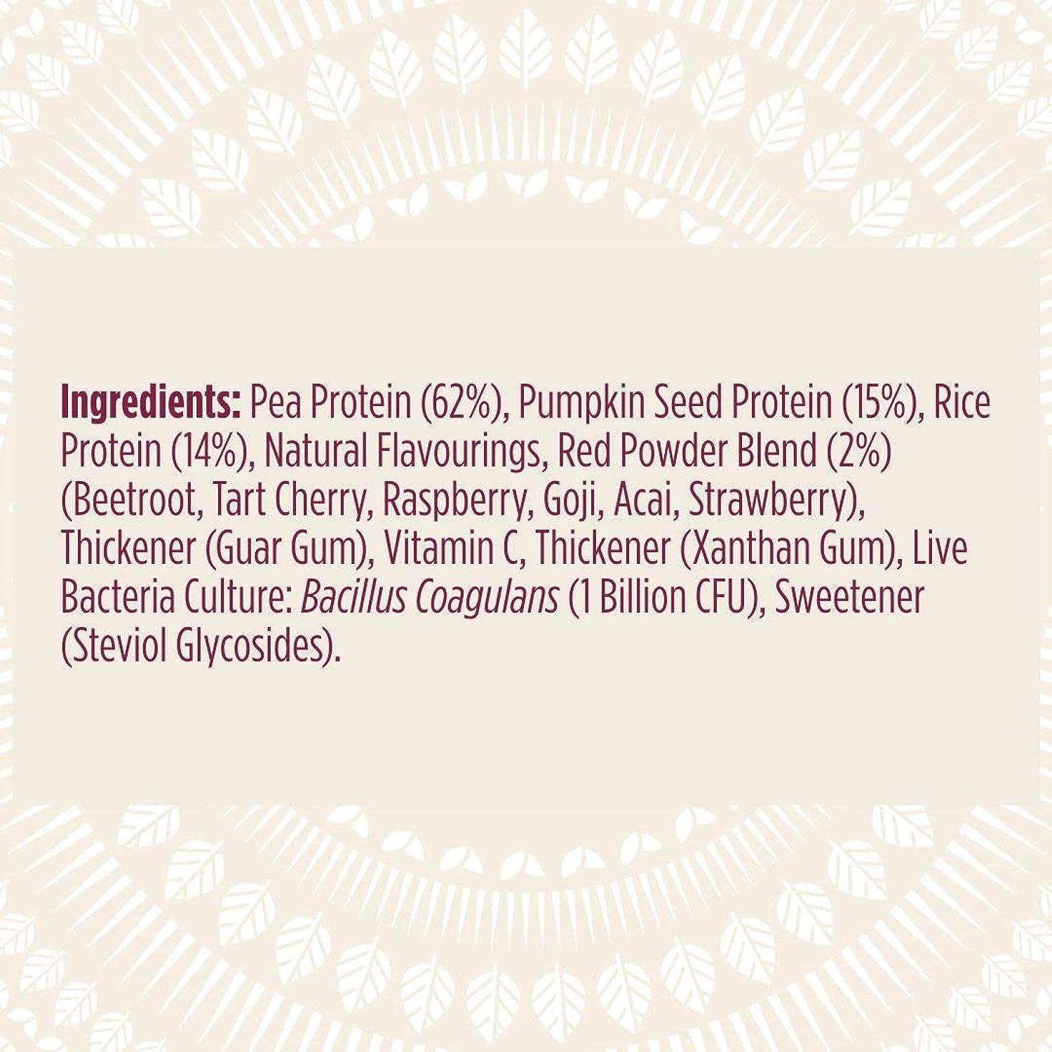 IngredientsPea Protein (62%), Pumpkin Seed Protein (15%), Rice Protein (14%), Natural Flavourings, Red Powder Blend (2%) (Beetroot, Tart Cherry, Raspberry, Goji, Acai, Strawberry), Thickener (Guar Gum), Vitamin C, Thickener (Xanthan Gum), Live Bacteria Culture: Bacillus Coagulans (1 Billion CFU), Sweetener (Steviol Glycosides).