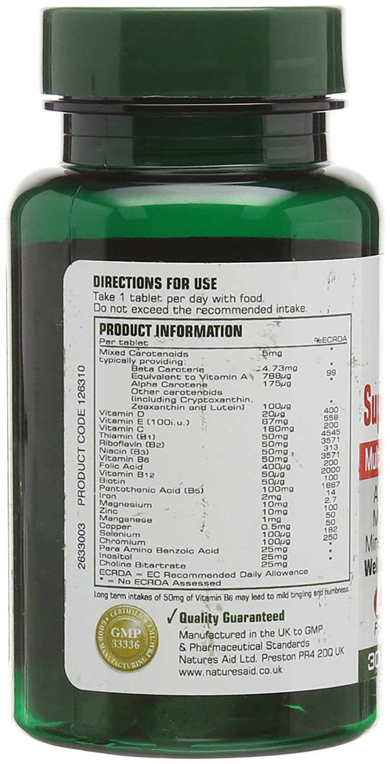 Natures Aid Quantum is an elite, ultra potent, daily multi-vitamin and mineral formula to support optimum performance. This high strength multi-vitamin and mineral includes nutrients such as B Vitamin Complex to help support a reduction in tiredness and fatigue, normal energy-yielding metabolism and normal functioning of the nervous system. Vitamin B5 to support normal mental performance. Zinc to help maintain normal cognitive function, normal vision, normal hair, skin and nails and normal functioning of the immune system. Selenium to support normal thyroid function and to protect cells against oxidative stress. Chromium which maintains normal macronutrient metabolism and normal blood glucose levels. Available in 30 tablets.