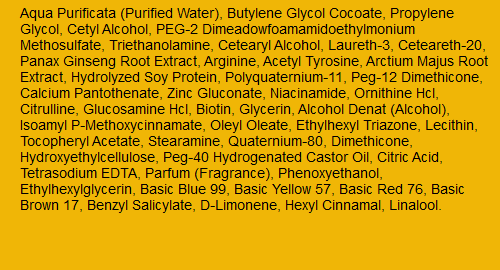 IngredientsAqua Purificata (Purified Water), Butylene Glycol Cocoate, Propylene Glycol, Cetyl Alcohol, PEG-2 Dimeadowfoamamidoethylmonium Methosulfate, Triethanolamine, Cetearyl Alcohol, Laureth-3, Ceteareth-20, Panax Ginseng Root Extract, Arginine, Acetyl Tyrosine, Arctium Majus Root Extract, Hydrolyzed Soy Protein, Polyquaternium-11, Peg-12 Dimethicone, Calcium Pantothenate, Zinc Gluconate, Niacinamide, Ornithine Hcl, Citrulline, Glucosamine Hcl, Biotin, Glycerin, Alcohol Denat (Alcohol), Isoamyl P-Methoxycinnamate, Oleyl Oleate, Ethylhexyl Triazone, Lecithin, Tocopheryl Acetate, Stearamine, Quaternium-80, Dimethicone, Hydroxyethylcellulose, Peg-40 Hydrogenated Castor Oil, Citric Acid, Tetrasodium EDTA, Parfum (Fragrance), Phenoxyethanol, Ethylhexylglycerin, Basic Blue 99, Basic Yellow 57, Basic Red 76, Basic Brown 17, Benzyl Salicylate, D-Limonene, Hexyl Cinnamal, Linalool.