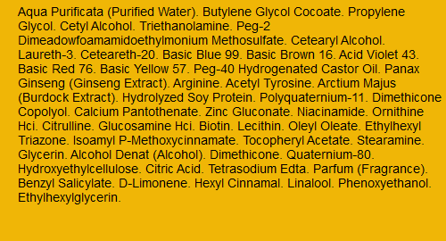 IngredientsAqua Purificata (Purified Water). Butylene Glycol Cocoate. Propylene Glycol. Cetyl Alcohol. Triethanolamine. Peg-2 Dimeadowfoamamidoethylmonium Methosulfate. Cetearyl Alcohol. Laureth-3. Ceteareth-20. Basic Blue 99. Basic Brown 16. Acid Violet 43. Basic Red 76. Basic Yellow 57. Peg-40 Hydrogenated Castor Oil. Panax Ginseng (Ginseng Extract). Arginine. Acetyl Tyrosine. Arctium Majus (Burdock Extract). Hydrolyzed Soy Protein. Polyquaternium-11. Dimethicone Copolyol. Calcium Pantothenate. Zinc Gluconate. Niacinamide. Ornithine Hci. Citrulline. Glucosamine Hci. Biotin. Lecithin. Oleyl Oleate. Ethylhexyl Triazone. Isoamyl P-Methoxycinnamate. Tocopheryl Acetate. Stearamine. Glycerin. Alcohol Denat (Alcohol). Dimethicone. Quaternium-80. Hydroxyethylcellulose. Citric Acid. Tetrasodium Edta. Parfum (Fragrance). Benzyl Salicylate. D-Limonene. Hexyl Cinnamal. Linalool. Phenoxyethanol. Ethylhexylglycerin.