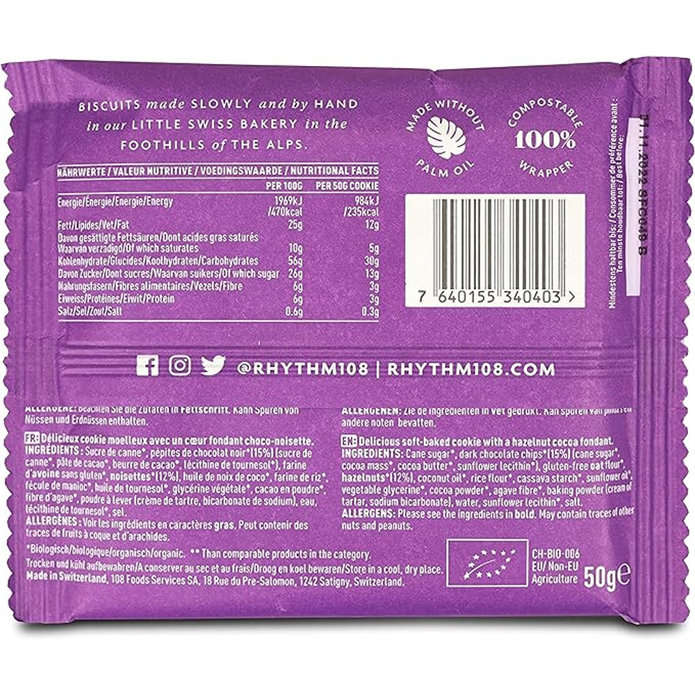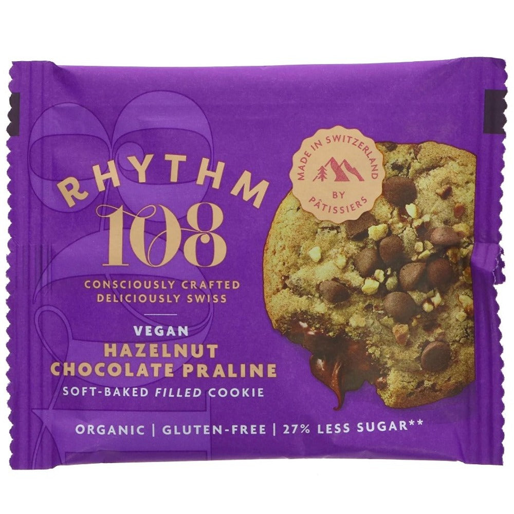 Rhythm 108?s Swiss Vegan Hazelnut Chocolate Praline Soft-Baked Filled Cookie is a soft and chewy blonde cookie, filled with a creamy chocolate hazelnut spread and topped with a sprinkle of toasted hazelnuts and mini Swiss chocolate chips. The perfect indulgence on the go or for whenever and wherever you fancy a treat.