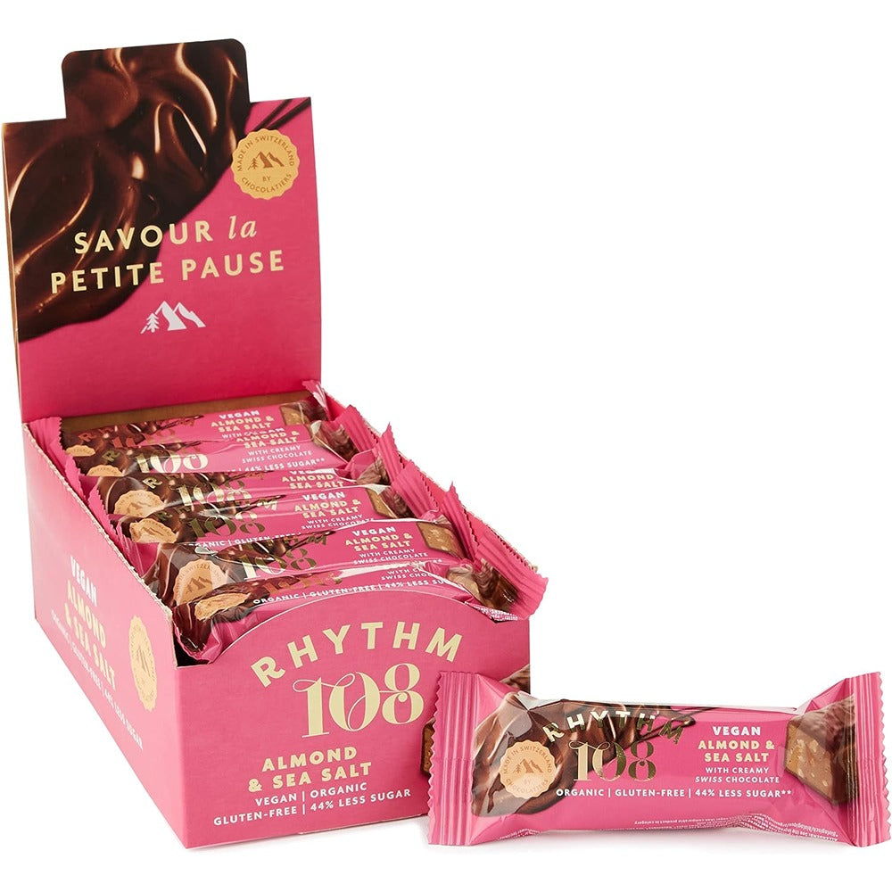 Rhythm 108's Swiss vegan Almond & Sea Salt Bar is filled with smooth almond butter and almond pieces, then dipped in a creamy Swiss vegan chocolate coating; the perfect balance of sweet and salty. These Swiss vegan chocolate bars are the perfect size to be enjoyed as a luxury treat any time of the day