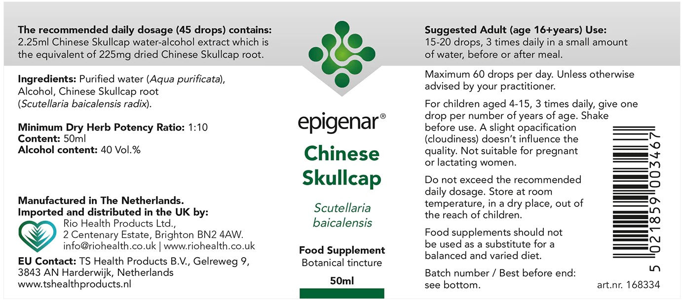 1:10 tincture of Scutellaria baicalensis (Chinese Skullcap). Easy to dose drops. Suitable for vegetarians and vegans.