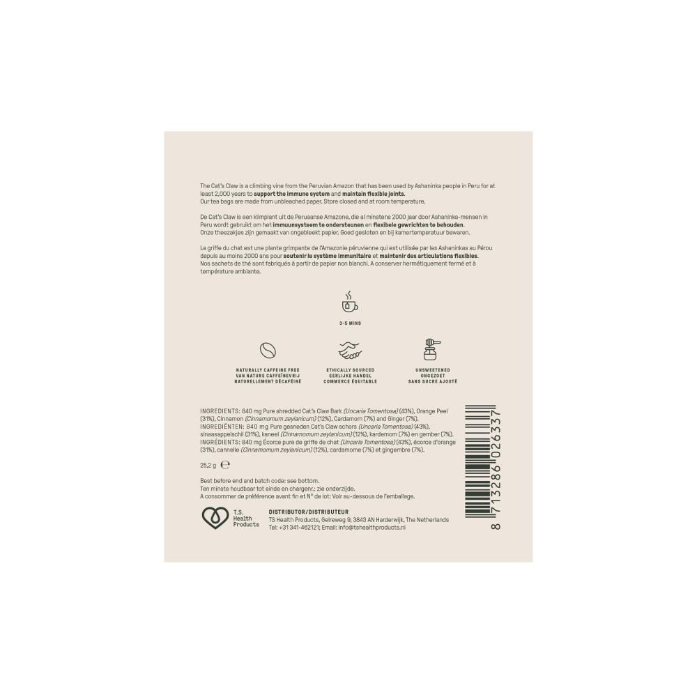 Ingredients840 mg Pure shredded Cat’s Claw Bark (Uncaria Tomentosa) (43%), Orange Peel (31%), Cinnamon (Cinnamomum zeylanicum) (12%), Cardamom (7%) and Ginger (7%).