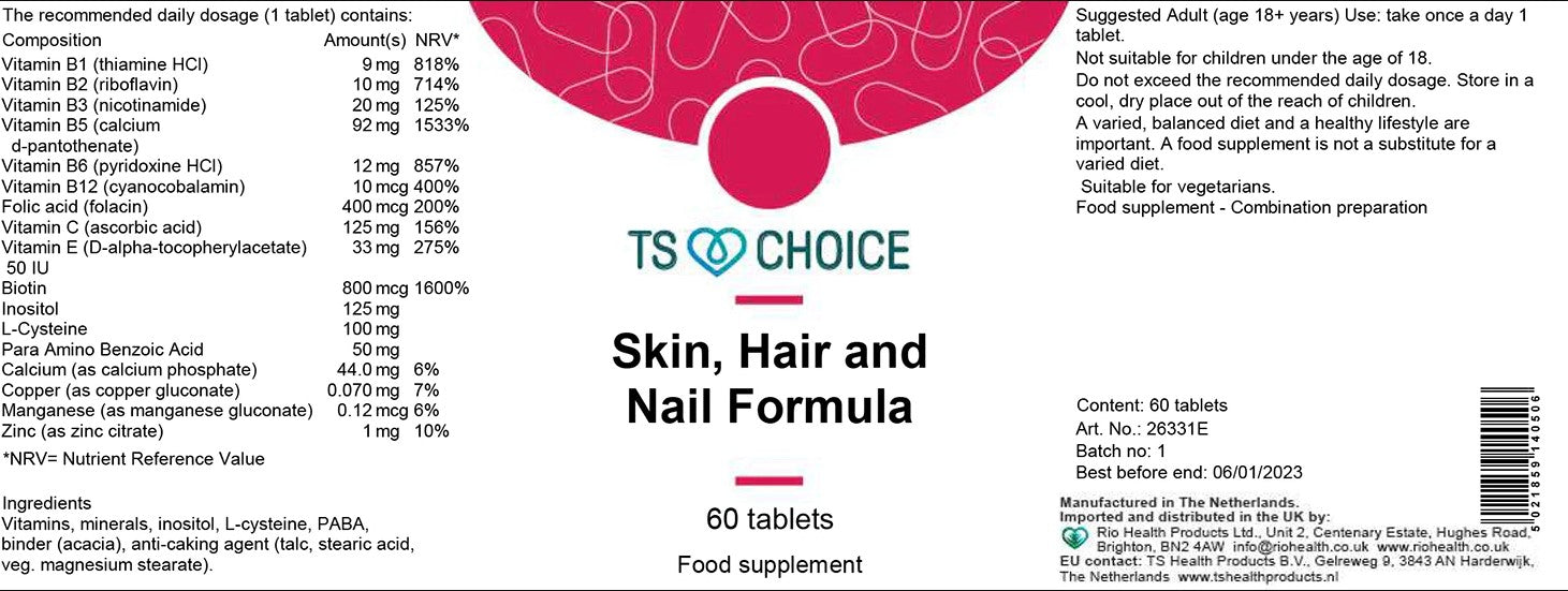 IngredientsVitamin 1B (thiamine HCI) 20mg, Vitamin B2 (riboflavin) 20mg, Vitamin B3 (nicotinamide) 40mg, Vitamin B5 (calcium-pantothenate) 200mg, Vitamin B6 (pyridoxine HCI) 30mg, Vitamin B12 (cyanoccobalamin) 20mcg, Folic acid (folade) 800mcg, Vitamin C (Ascobic Acid) 250mg, Vitamin E (dl-alpha-tocopherol) (100ie) 200mg, Biotin 800mcg, Inositol 250mg, L-Cysteine 200mg, PABA 100mg, Calcium (phosphate) 270mg, Copper (gluconate) 0.1mg, Manganese (gluconate) 0.2mg, Zinc (citrate) 6mg, acacia, magnesium stearate, talcum, stearate acid.