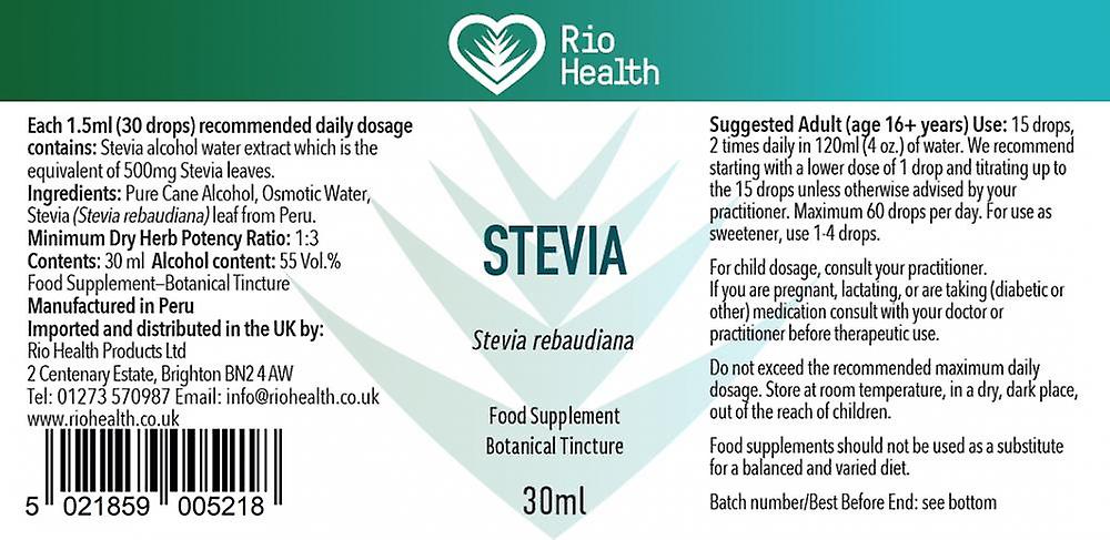 Stevia, also known as ‘sweet leaf’ has been used for centuries in South America. Stevia is also used in Ayurveda. This well-known natural zero-calorie sweetener is intensely sweet but does not cause insulin release. It can be used in hot drinks and recipes as well as for therapeutic use.Rio Health Stevia Tincture is an ecologically wildcrafted 1:3 tincture of Stevia rebaudiana whole leaf provided with a calibrated dropper for easy dispensing and has no bitter aftertaste.