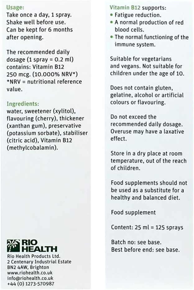 IngredientsWater, sweetener (xylitol), flavouring (cherry), thickener (xanthan gum), preservative (potassium sorbate), stabiliser (citric acid), Vitamin B12 (methylcobalamin) 250mcg.
