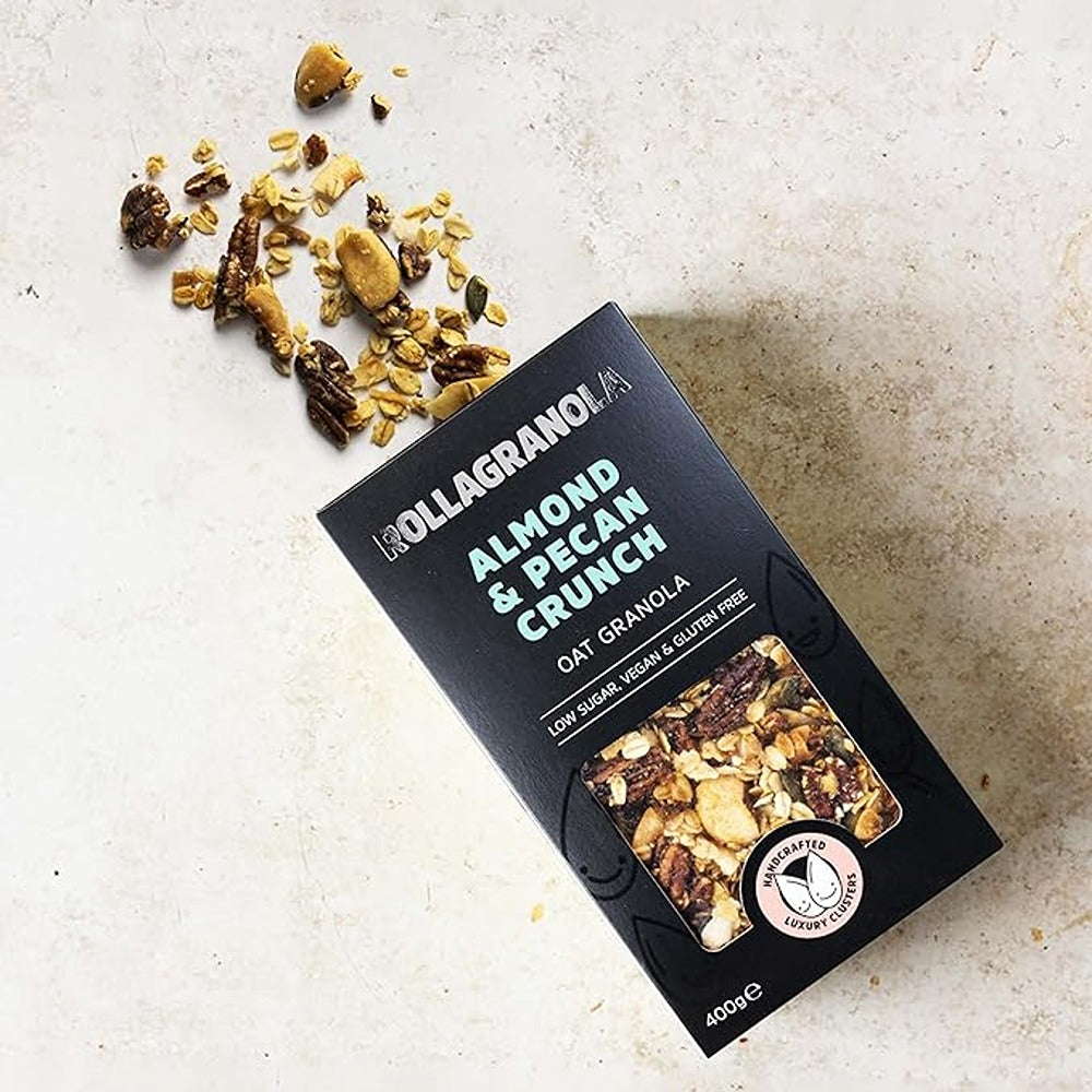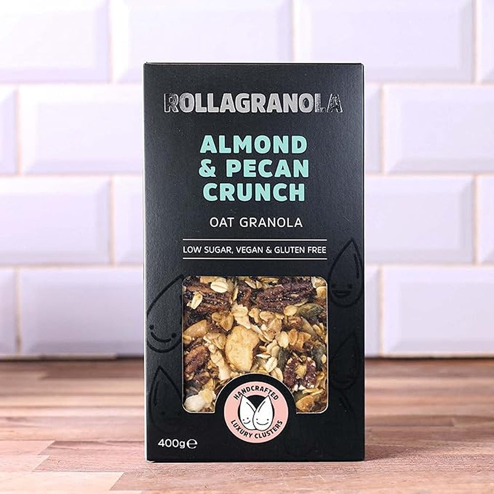 - OVER 21% NUTS: Our Almond & Pecan Crunch granola is low in sugar but packed full of flavour thanks to our unique blend of nuts, energising seeds, coconut flakes and vanilla. This granola is great for a gluten free diet. Pecans, Almonds and Brazil nuts make up over 21% of this granola, making it nuttier than the average granola. The trio of energising seeds (Sunflower, Pumpkin and Chia) combined with gluten-free oats, coconut and vanilla make this a great tasting way to start your day.