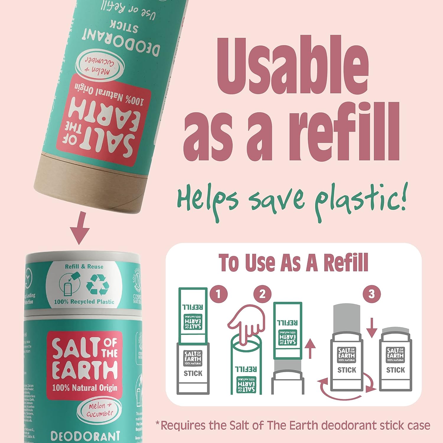 Fragranced with a mix of natural botanical extracts and oils, our Melon & Cucumber Vegan Natural Deodorant Stick Refills, offer long-lasting, effective protection from body odour. It is made from 100% natural ingredients and is the perfect scent for summer. Salt of the Earth natural stick deodorants are made from a mixture of Shea Butter, Coconut Oil, Sunflower Seed oil, Rosemary Leaf Extract and Carnauba Wax. MAIN FEATURES Fresh Natural Fragrance Long Lasting Protection 100% Natural Ingredients - Certified COSMOS Natural 100% Vegan - Approved by both the Vegan Society & Vegetarian Society Leaping Bunny Approved Aluminium & Paraben Free Does NOT contain Controversial Chemicals Kind to Skin 100% Recyclable Cardboard Packaging More Sustainable Made in the UK MORE SUSTAINABLE Our Melon & Cucumber stick refills are plastic free and packaged in 100% recyclable cardboard, helping you to reduce your plastic waste and carbon footprint. OUR VEGAN CREDENTIALS The entire Salt of the Earth range is approved by both the Vegan and Vegetarian Societies, and we are Leaping Bunny approved. Leaping Bunny is the best assurance that a company has made a genuine commitment to ending animal testing.