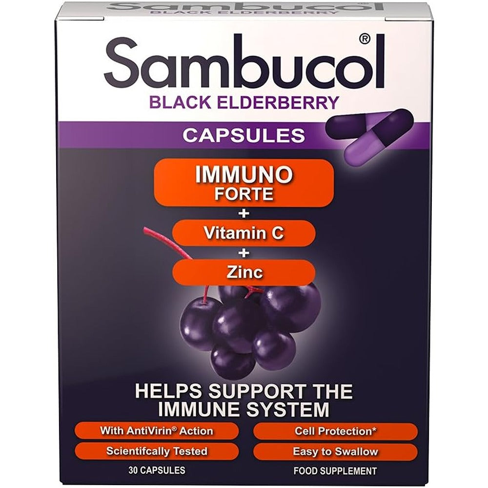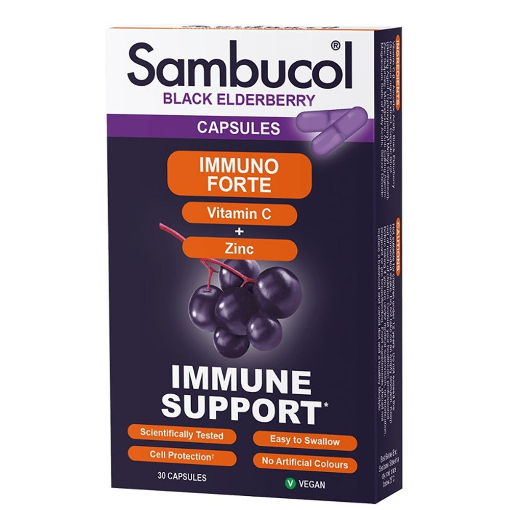 - FAMILY IMMUNE SUPPORT - Sambucol Immune Forte Capsules contains Black Elderberries as well as Vitamin C and Zinc to help strengthen the immune system. Suitable for adults and children aged 12+, perfect for all-year-round immune support.