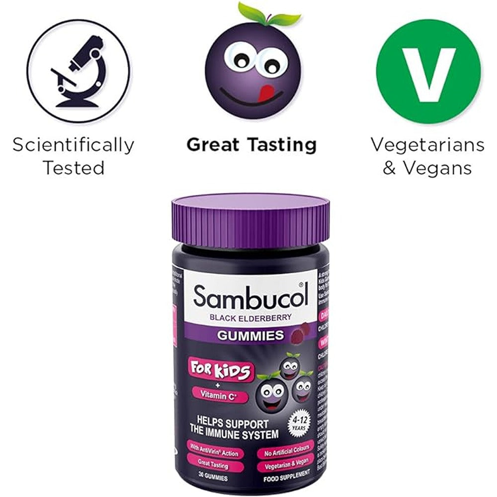 - DELICIOUS - Sambucol is a range of great tasting food supplements founded on the unique qualities of Black Elderberries. Sambucol Kids gummies are suitable for Vegetarians and Vegans