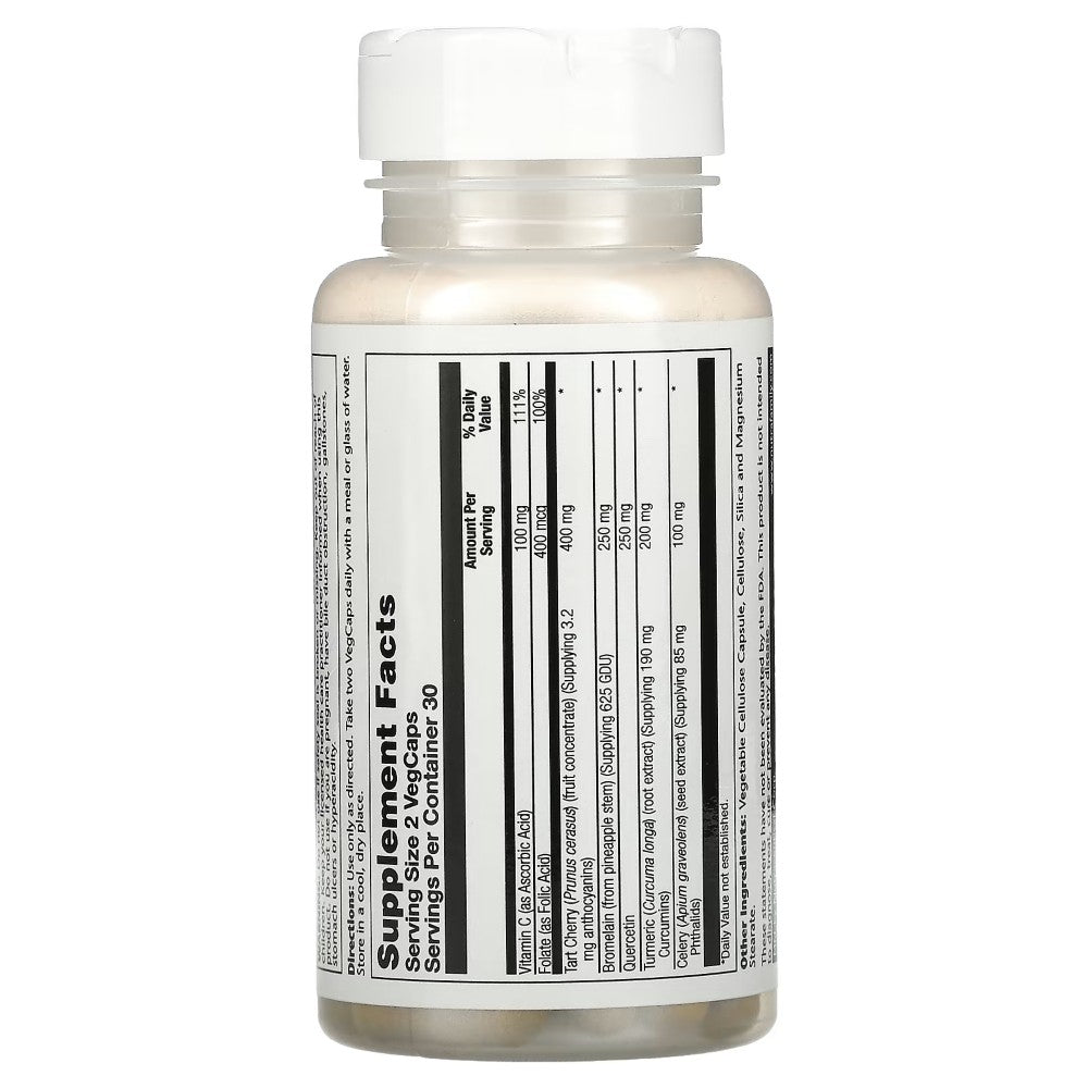 Tart Cherry, Bromelain, Quercetin, Turmeric, Celery, Hydroxypropylmethyl Cellulose Capsule, Silica, Magnesium Stearate (Flow Agent).