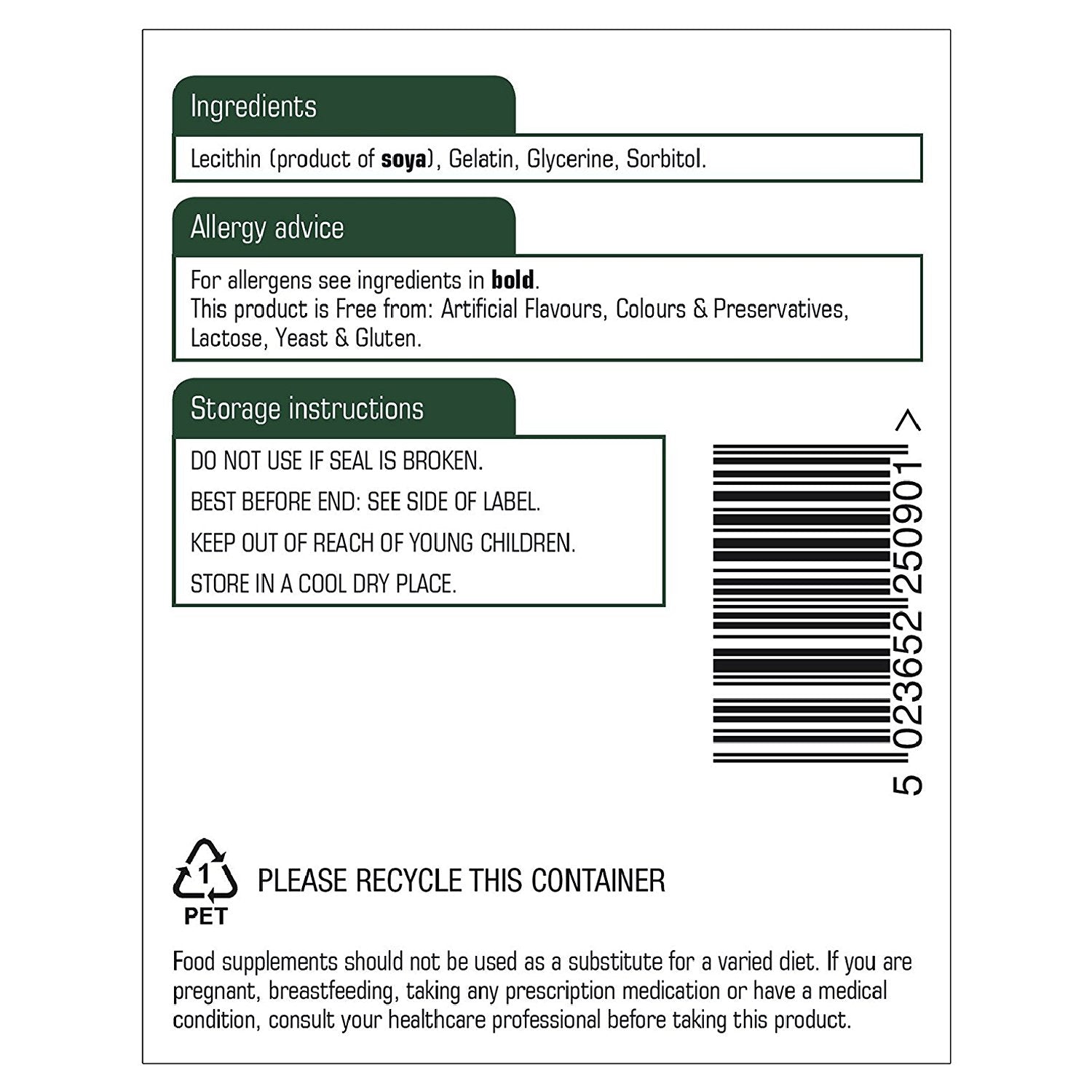 IngredientsLecithin (product of soya), Gelatin, Glycerine.