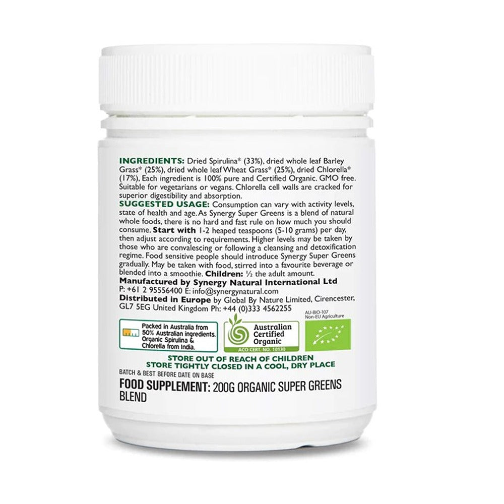 Synergy super Greens is a synergistic blend of nature's most nutrient dense green superfoods, Spirulina, Chlorella, Barley Grass and Wheat Grass. It provides a wide spectrum of highly bioavailable whole food nutrients, balanced by nature and absorbed more effectively than those found in synthetic formulations. It can contribute to your 5 + Daily servings of vegetables in a convenient and affordable way. When choosing a super Greens brand, consider that meaningful amounts of a few potent ingredients may be significantly more beneficial than low amounts of a large number of ingredients. Spirulina is a microscopic freshwater plant with a high content of easily absorbed nutrients. Gram for gram, it's the most nutritious whole food known to humankind. Chlorella is also a microscopic freshwater plant that contains more chlorophyll than any other plant. It can help cleanse and detoxify the body. Barley grass and Wheat Grass are highly alkalizing green plants high in chlorophyll, fibre and a range of other important nutrients. They can help counter the over-acidity of many processed foods.
