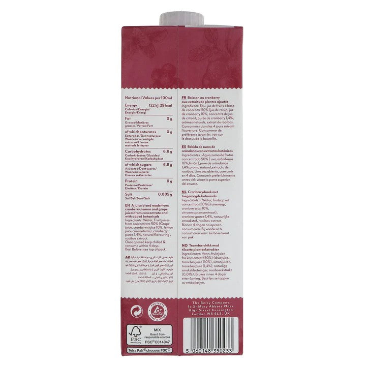 Water, Cranberry Juice from Concentrate,20%, Natural Sugars, Cranberry Puree, 2%, Antioxidant: Ascorbic Acid