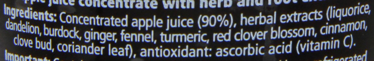 IngredientsConcentrated Apple Juice (90%), Herbal Extracts (Liquorice, Dandelion, Burdock, Ginger, Fennel, Turmeric, Red Clover Blossom, Cinnamon, Clove Bud, Coriander Leaf), Antioxidant: Ascorbic Acid.
