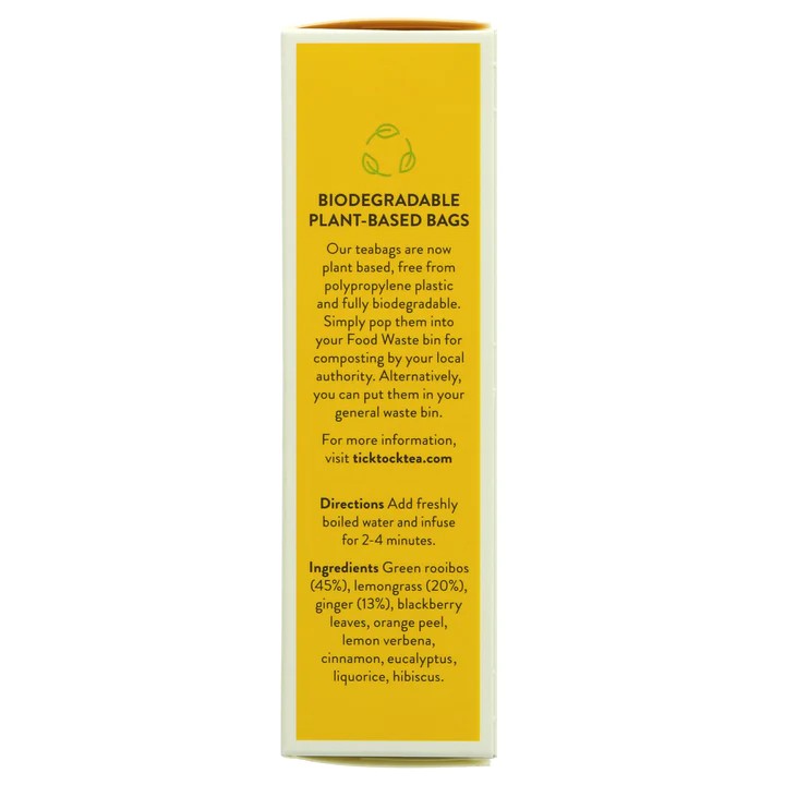 Green Rooibos, Lemongrass, Ginger, Blackberry Leaves, Orange Peel, Lemon Verbena, Cinnamon, Eucalyptus Leaves, Liquorice, Hibiscus.