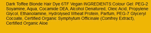 IngredientsDark Toffee Blonde Hair Dye 6TF Vegan INGREDIENTS:Colour Gel: PEG-2 Soyamine, Aqua, Cocamide DEA, Alcohol Denatured, Oleic Acid, Propylene Glycol, Ethanolamine, Hydrolysed Wheat Protein, Parfum, PEG-7 Glyceryl Cocoate, Certified Organic Symphytum Officinale (Comfrey Extract), Certified Organic Aloe