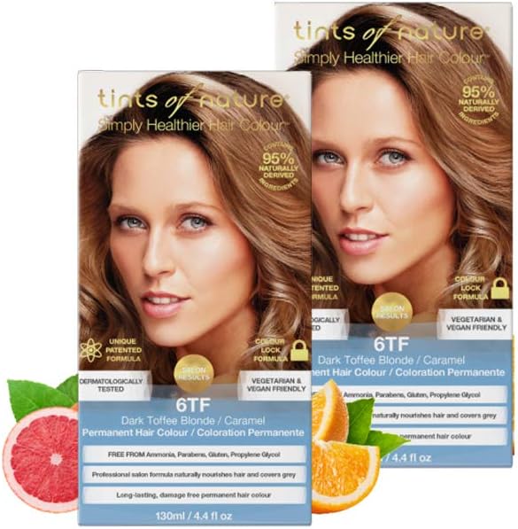 Tints of Nature Permanent Hair Colour is vegan-friendly and cruelty-free home hair dye. All of our permanent home hair colours contain the lowest possible levels of PPD and remain ammonia, paraben and resorcinol free. Gently nourish and protect your hair, provide maximum colour performance and up to 100 percent grey coverage and give long-lasting results. Available in 6TF dark toffee blonde shade.