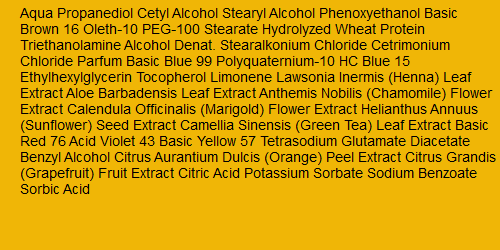 Aqua Propanediol Cetyl Alcohol Stearyl Alcohol Phenoxyethanol Basic Brown 16 Oleth-10 PEG-100 Stearate Hydrolyzed Wheat Protein Triethanolamine Alcohol Denat. Stearalkonium Chloride Cetrimonium Chloride Parfum Basic Blue 99 Polyquaternium-10 HC Blue 15 Ethylhexylglycerin Tocopherol Limonene Lawsonia Inermis (Henna) Leaf Extract Aloe Barbadensis Leaf Extract Anthemis Nobilis (Chamomile) Flower Extract Calendula Officinalis (Marigold) Flower Extract Helianthus Annuus (Sunflower) Seed Extract Camellia Sinensis (Green Tea) Leaf Extract Basic Red 76 Acid Violet 43 Basic Yellow 57 Tetrasodium Glutamate Diacetate Benzyl Alcohol Citrus Aurantium Dulcis (Orange) Peel Extract Citrus Grandis (Grapefruit) Fruit Extract Citric Acid Potassium Sorbate Sodium Benzoate Sorbic Acid