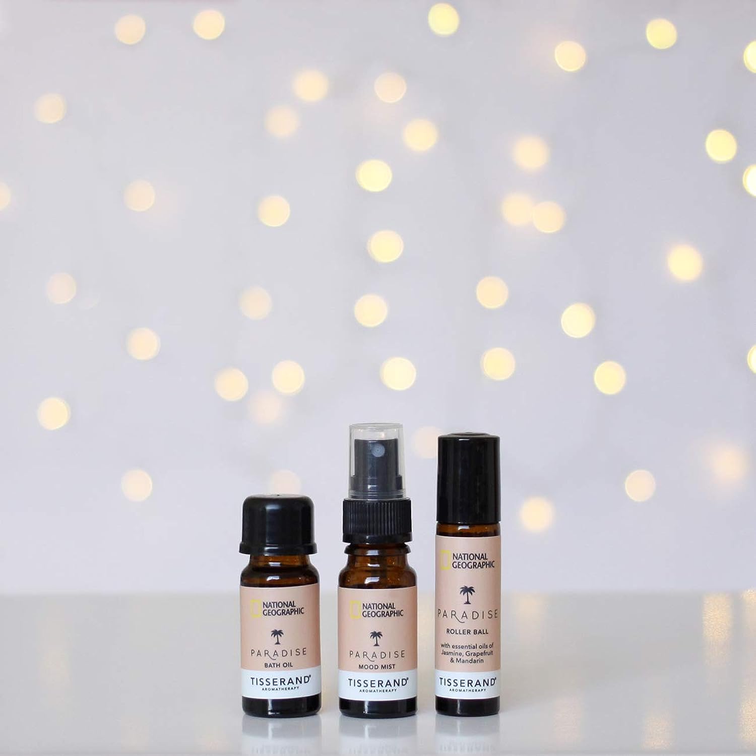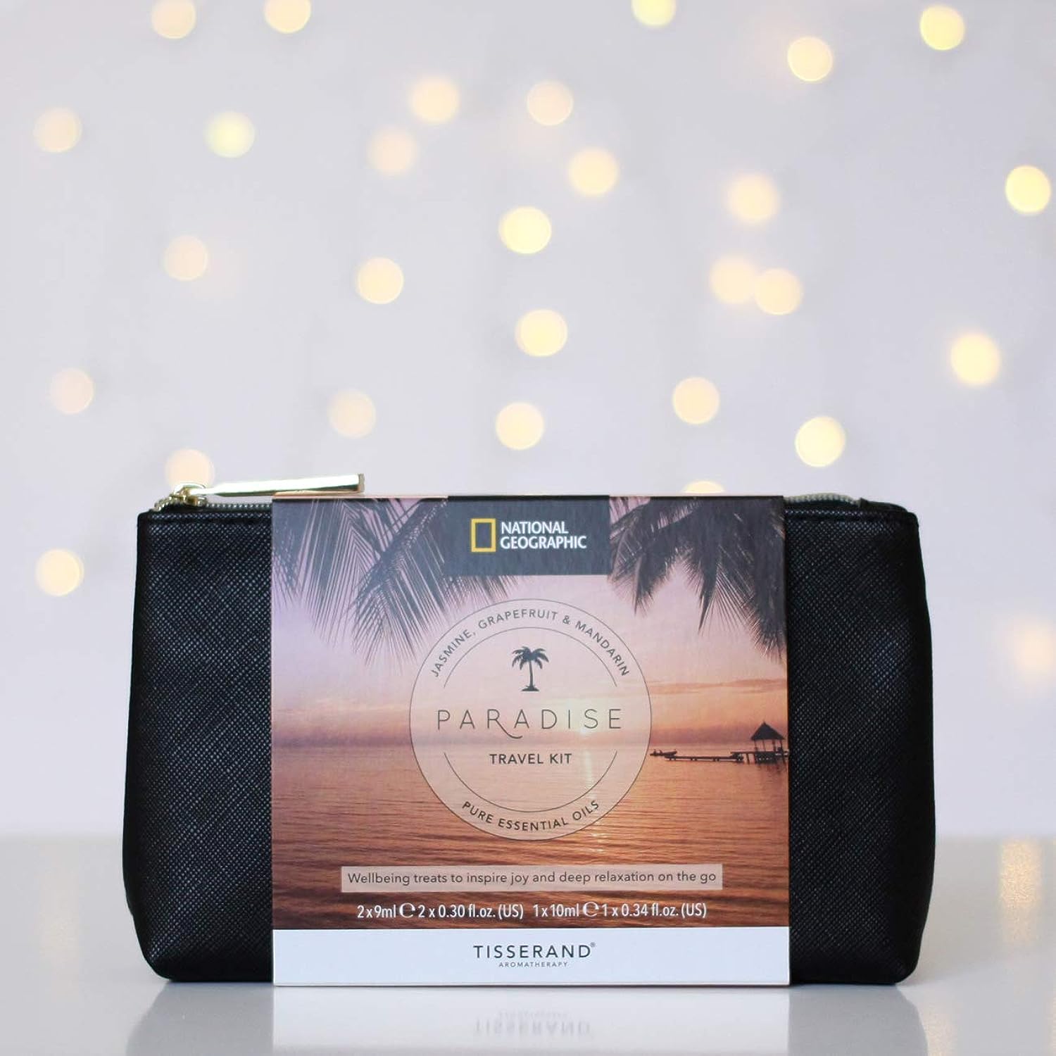 Tisserand Aromatherapy National Geographic Paradise Travel Kit Take your mind to a balmy tropical evening, where beachy sea mist catches and sparkles in the warm breeze. The Paradise Travel Kit includes a travel sized bath oil, mood mist and a roller ball in our Paradise blend, containing Jasmine, Grapefruit and Mandarin 100% natural pure essential oils, creating a warm, bright aroma to inspire joy and deep relaxation. Housed in our reusable vegan cosmetic bag, this collection of travel-sized treats, will help you to escape life’s turbulence on the go.