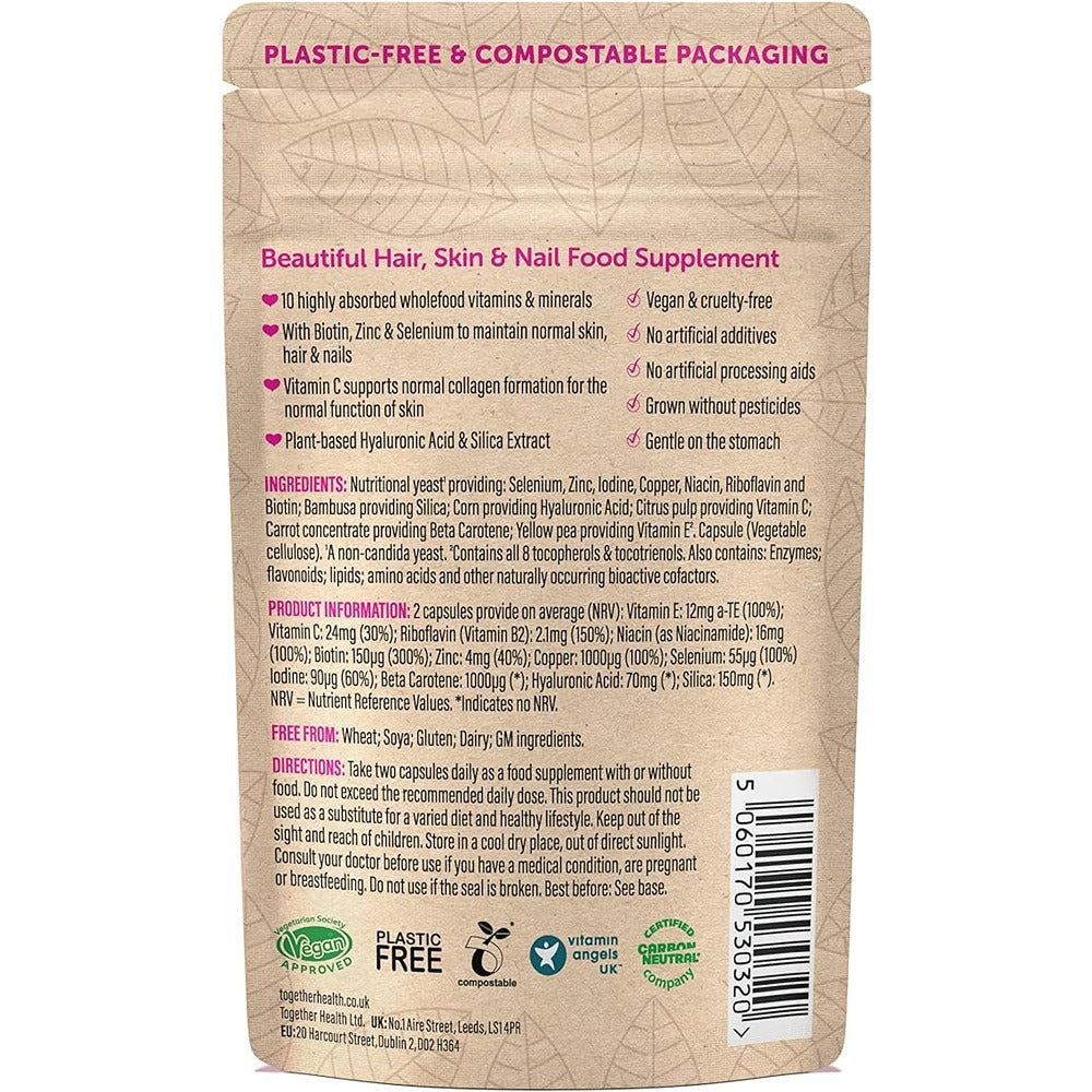 Together Health food and plant-based complex for the healthy maintenance of hair, skin and nail. Created an inner beauty supplement to make you look and feel that little bit extra special. Along with all the benefits of our much-loved food based vitamins and minerals, we've carefully selected a combination of natural, glow-giving nutrients to enrich your hair, skin and nails. Using whole food ingredients we have created vitamins and minerals that are easily absorbed and gentle on the stomach. Our formulation of unique collagen is protein rich and complete with essential cofactors that carry nutrients to where they're needed most in the skin. We also include natural silica from bamboo extract (which is, incidentally, the richest known natural source).