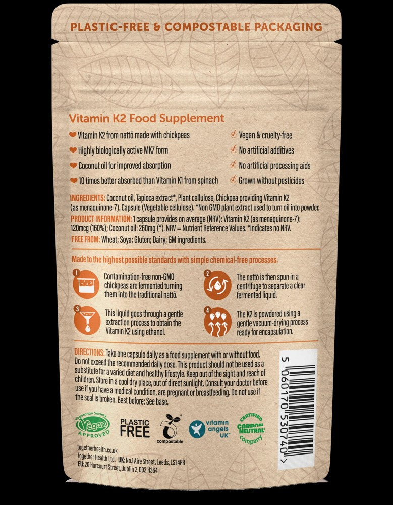 Coconut oil, Tapioca extract*, Plant cellulose, Chickpea providing Vitamin K2 (as menaquinone-7). Capsule (Vegetable cellulose). *Non GMO plant extract used to turn oil into powder.