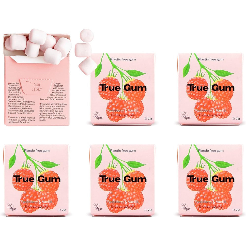 True Gum is a plastic free, vegan and sugar free chewing gum made on a chicle tree sap gum base. Sweetened with plant-based sweeteners xylitol and steviolglycosides and with all natural flavors. One of the most popular chewing gums we produce is Raspberry & Vanilla. It's a fresh and sweet gum that appeals to people of any age.