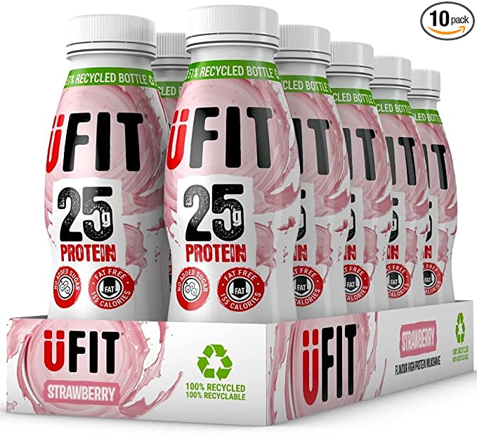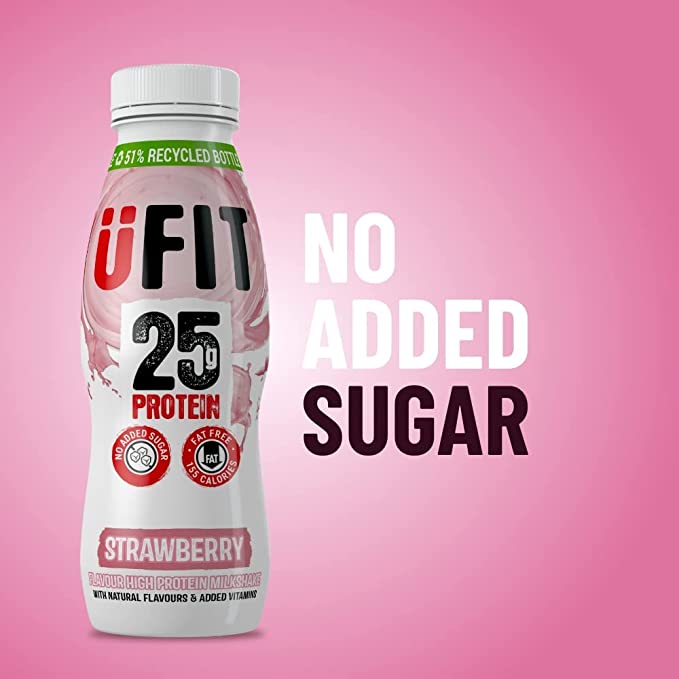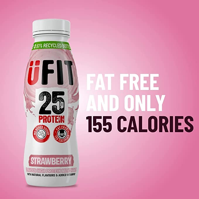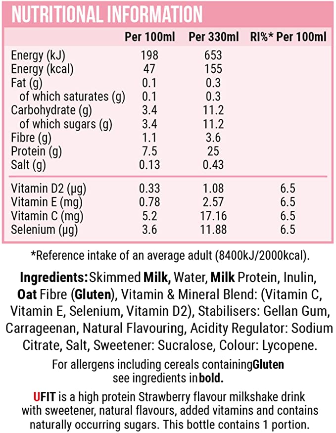 UFIT High Protein Shake Drink Strawberry 330ml . 25g Protein Fat Free, 155 Calories Vegetarian Society Approved. No Added Sugar. With Natural Flavours & Added Vitamins