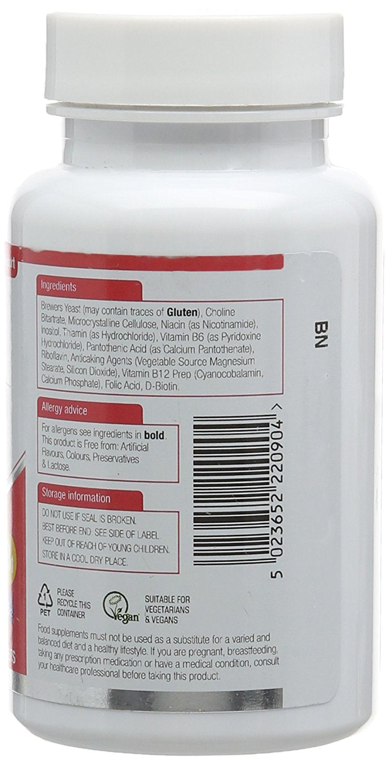 IngredientsBrewers Yeast, Choline Bitrate, Microcrystalline Cellulose, Niacin (as Nicotinamide), Inositol, Anticaking Agent (Silicon Dioxide). Thiamin (as Hydrochloride) Vitamin B6 (a Pyridoxine Hydrochloride), Pantothenic Acid (as Calcium Pantothenate), Vitamin B12 Prep (Vitamin B12, Mannitol) Riboflavin, Anticaking Agent (Vegetable Source Magnesium Stearate), Folic Acid, D-Biotin.