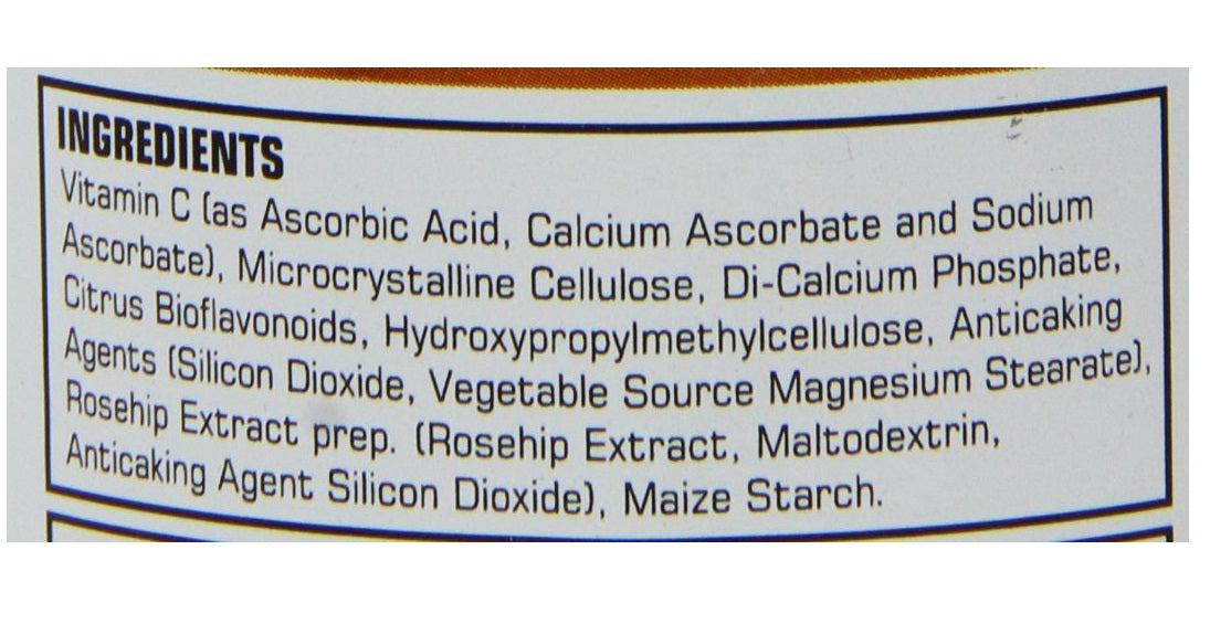 IngredientsVitamin C (as Ascorbic Acid, Sodium Ascorbate and Calcium Ascorbate), Microcrystalline Cellulose, Di-Calcium Phosphate, Rosehip Powder, Citrus Bioflavonoid prep (Citrus Bioflavonoids, Maltodextrin), Hydroxypropylmethylcellulose, Anticaking Agents (Silicon Dioxide, Vegetable Source Magnesium Stearate), Maize Starch.