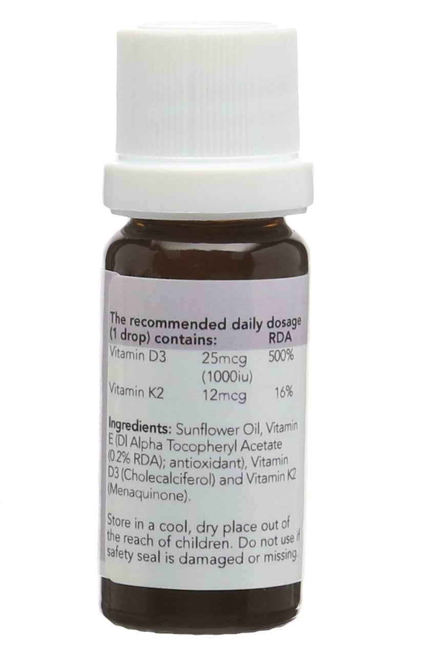 IngredientsSunflower Oil, Vitamin E (DI Alpha Tocopherol Acetate (0.2% RDA); antioxidant), Vitamin D3 (Cholecalciferol) 25mcg/1000iu (500% RDA), Vitamin K2 (Menaquinone) 12 mcg (16% RDA).