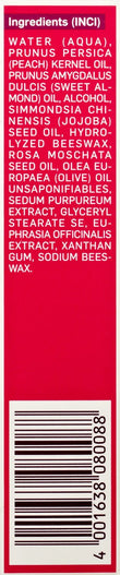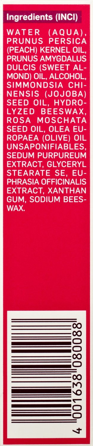 IngredientsWater (Aqua), Prunus Persica (Peach) Kernel Oil, Prunus Amygdalus Dulcis (Sweet Almond) Oil, Alcohol, Simmondsia Chinensis (Jojoba) Seed Oil, Hydrolyzed Beeswax, Rosa Moschata Seed Oil, Olea Europaea (Olive) Oil Unsaponifiables, Sedum Purpureum Extract, Glyceryl Stearate SE, Euphrasia Officinalis Extract, Xanthan Gum, Sodium Beeswax.