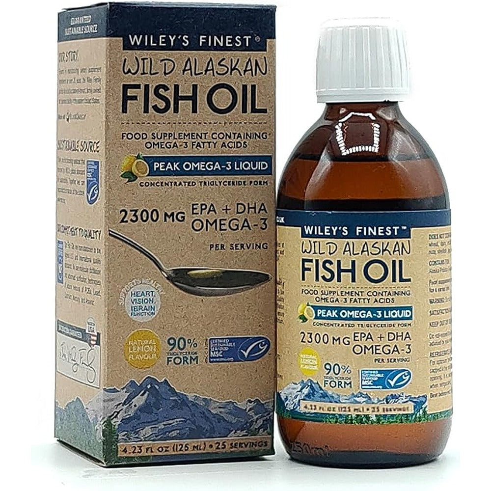The Wiley's Finest Wild Alaskan Fish Oil Peak Omega-3 Liquid has a natural lemon flavour and is guaranteed 90 percent triglyceride form. With 2150mg of EPA+DHA per teaspoon, it provides a concentrated dose of Omega-3 fatty acids in every serving. Available in 125 ml.