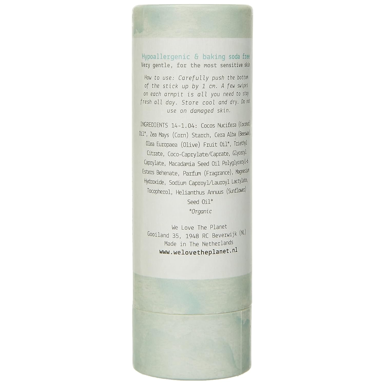 We Love The Planet deodorant cream consists of 100 Percent natural ingredients. There are no synthetic substances and aluminium added so that the deodorant is not harmful to your body. Better for your body and the planet. The natural ingredients in deodorants work soothing and moisturizing. The soft cream is quickly absorbed into your skin and does not clog the pores. It helps you stay fresh in a natural way. The deodorant cream is based on a combination of beeswax, Coconut oil and maize starch powder that make the deodorant easy to spread and your skin velvety soft. The Deodorizing effect comes from baking soda that neutralizes odors naturally. The so sensitive is specially formulated for people with hypersensitivity.